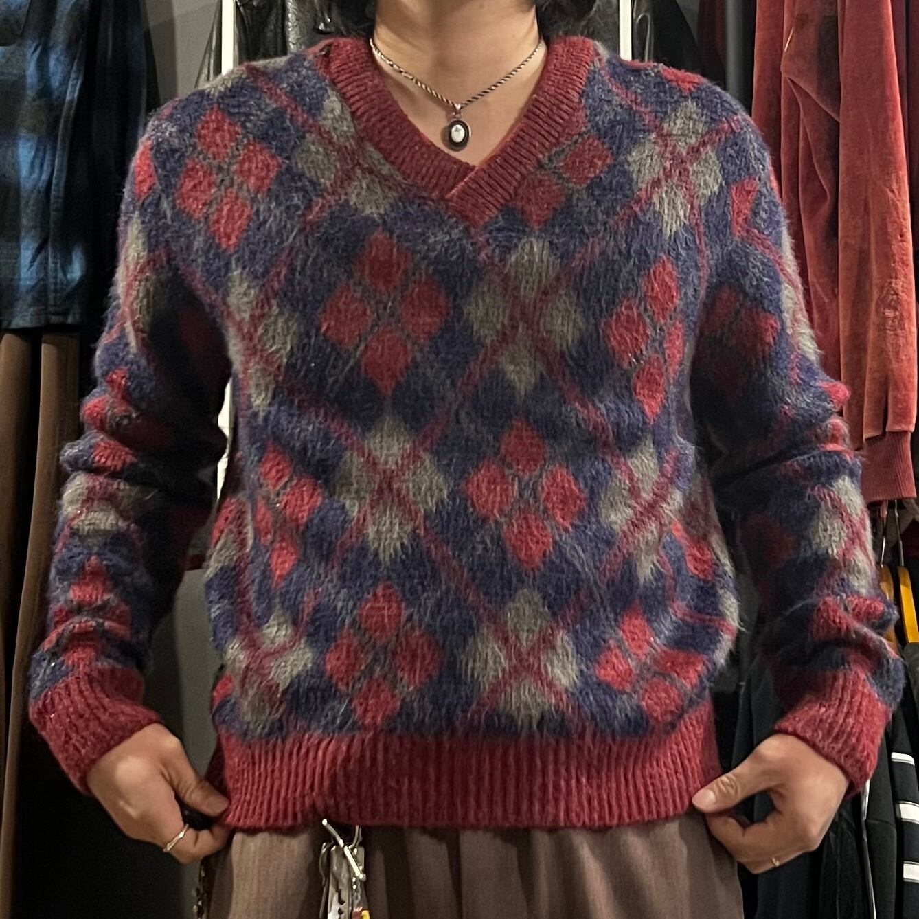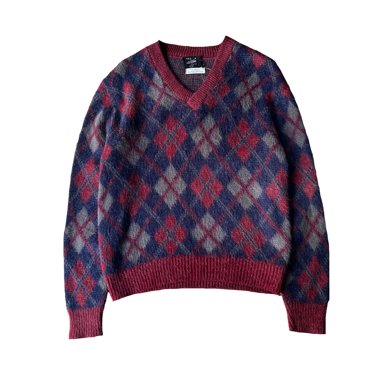 60s NATIONAL mohair×orlon v-neck argyle check sweater M