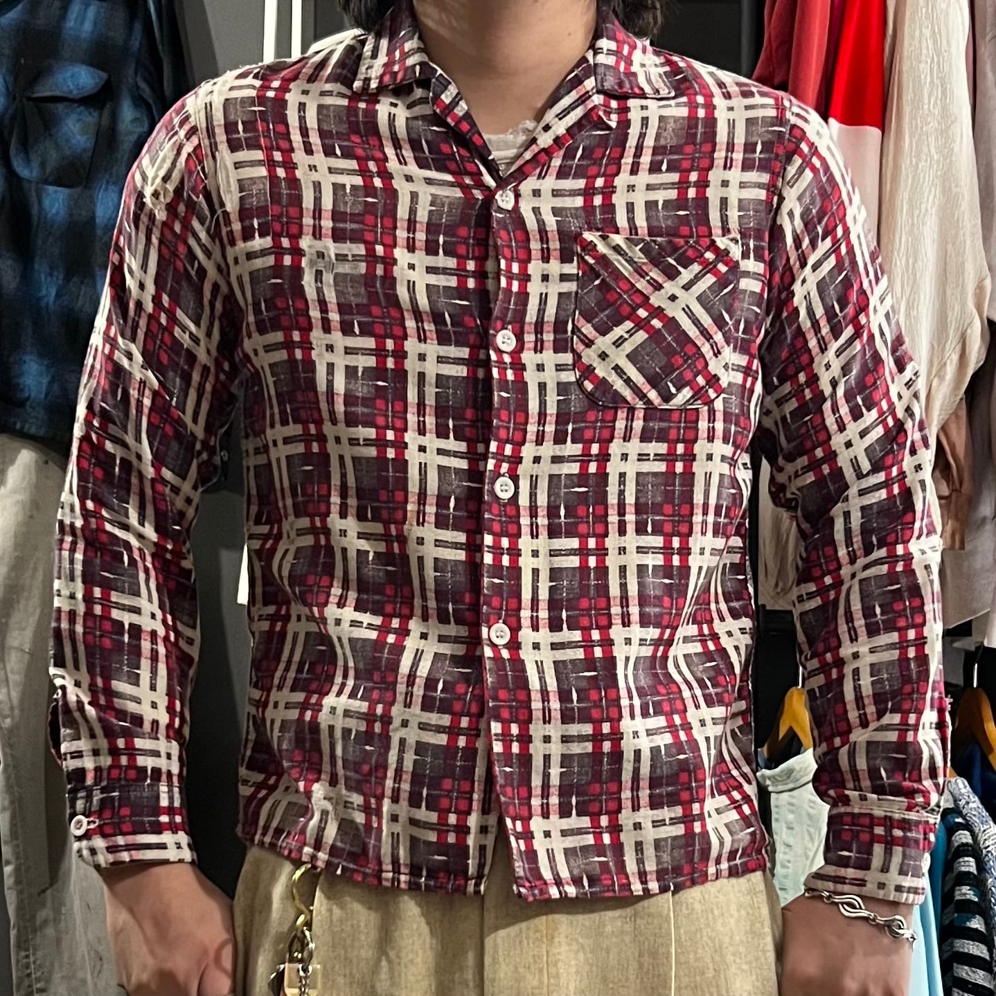 完品で残った皿ボタン、オープンカラーのボックスシルエット。