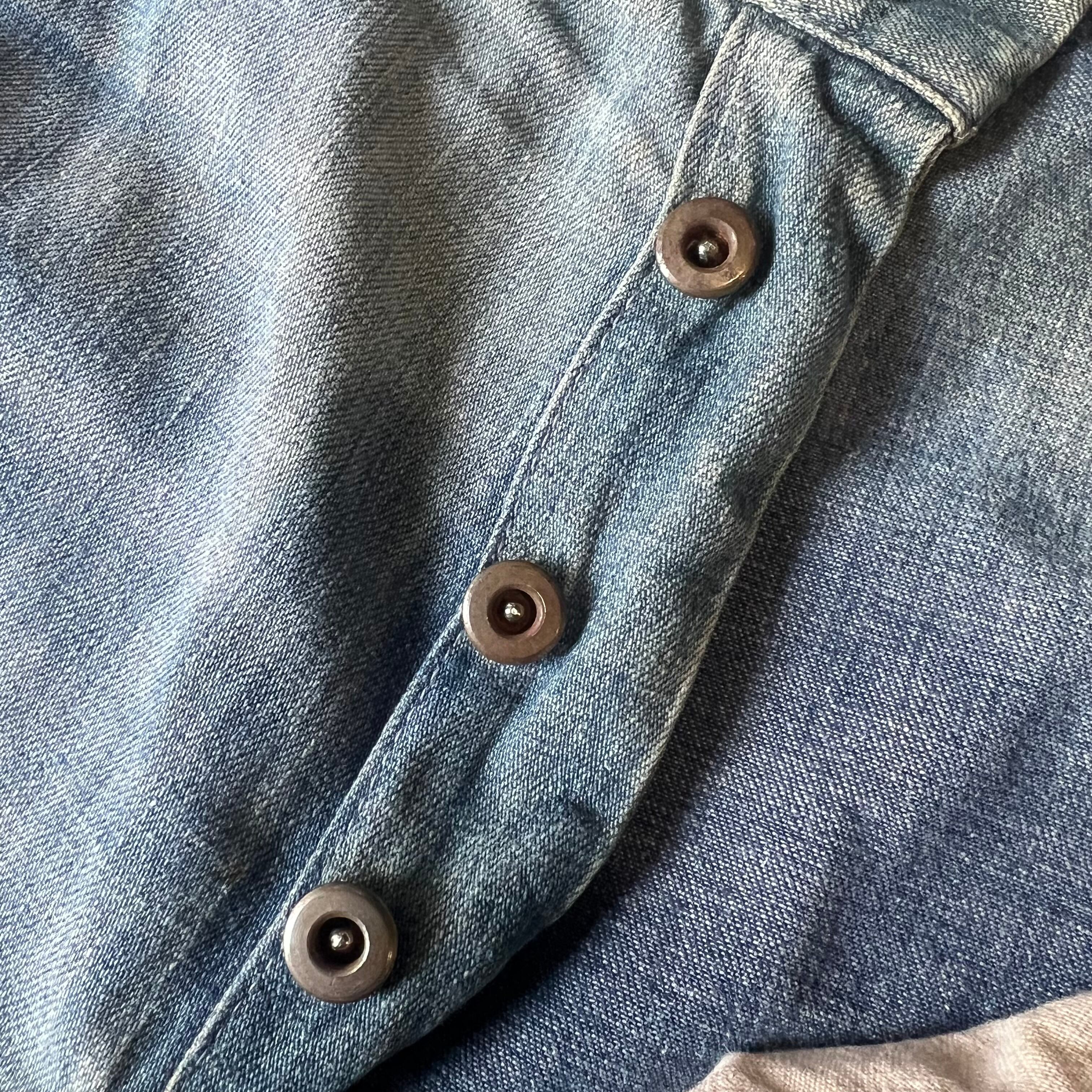 ドーナッツボタン、UFOリベット、サイドアウトシームはダブルステッチ、剥き出しの銅リベット。