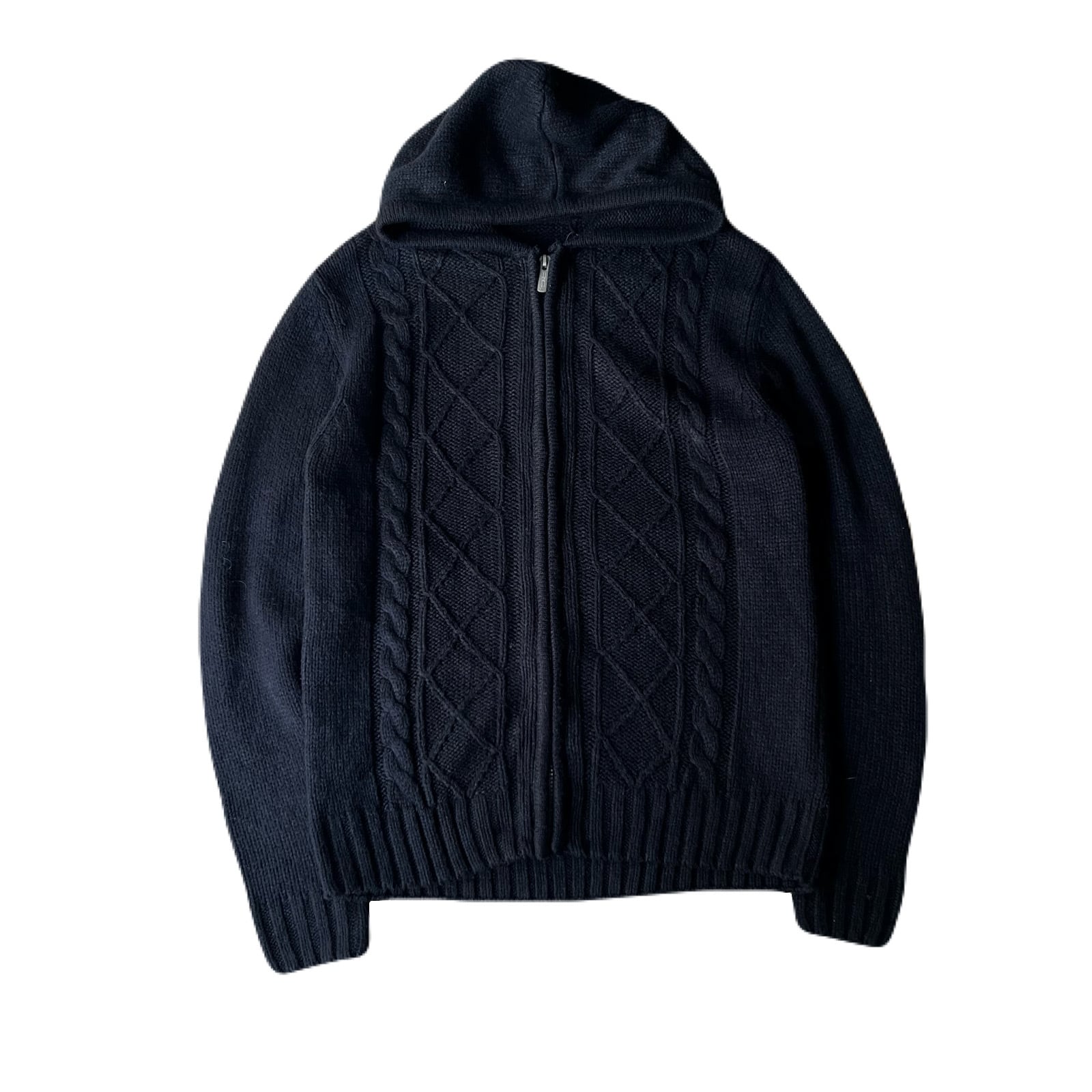 インナーに適したフードの被れるケーブルニット。