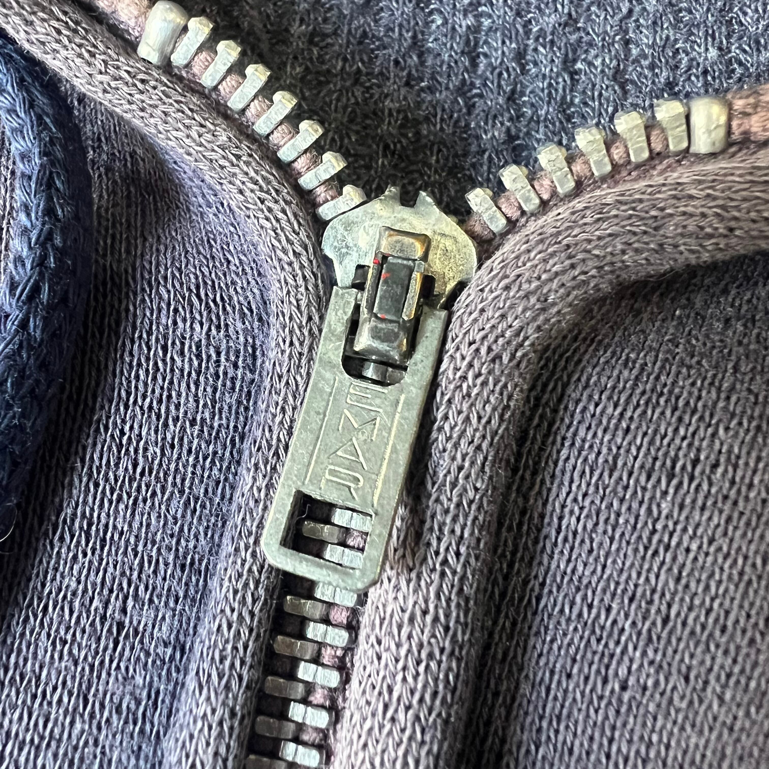 コットン100%のセットインスリーブ、吊り編み機仕立てられた筒状のリブ、アルミのEMARジッパー。