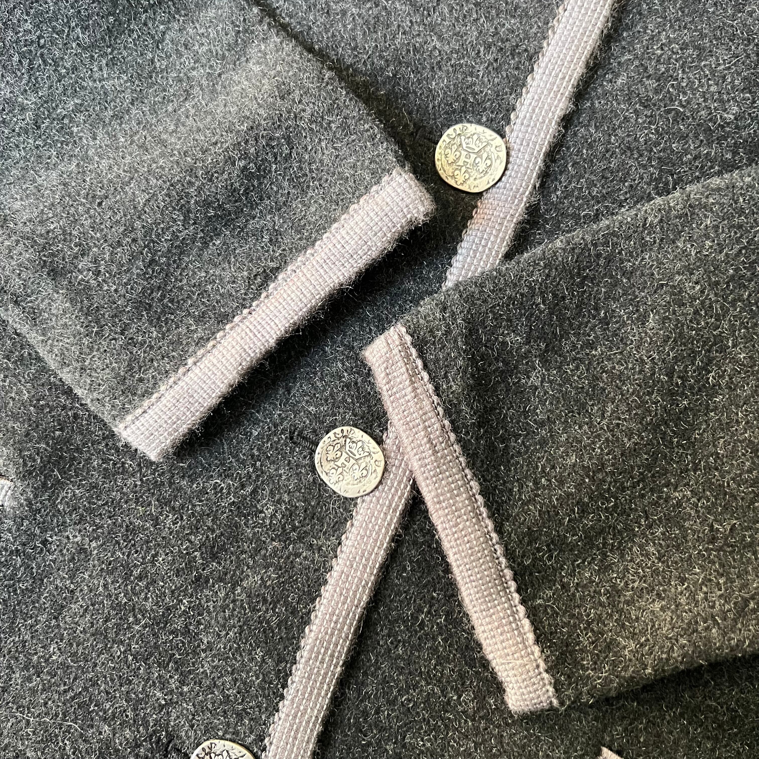 ブラックボディーにスミ黒のパイピング、シルバーのボタンが目を引く凝ったデザインの1着。