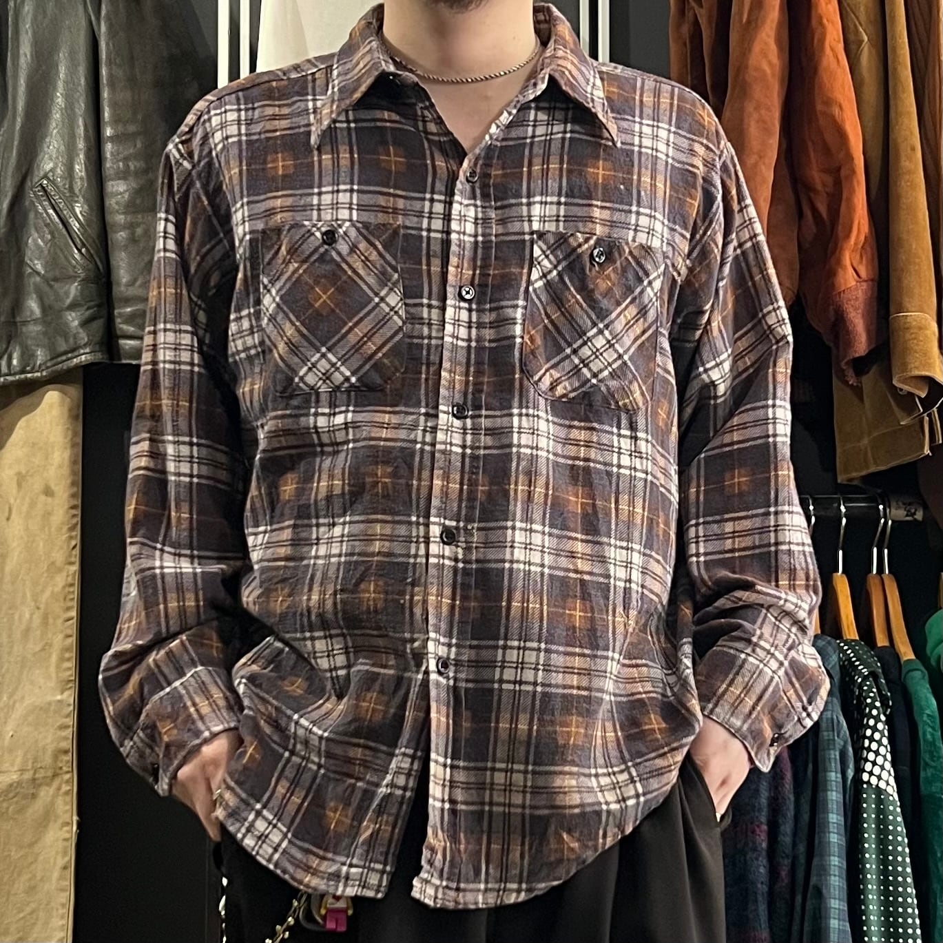 70s Mr.Leggs cotton print flannel check shirt XL