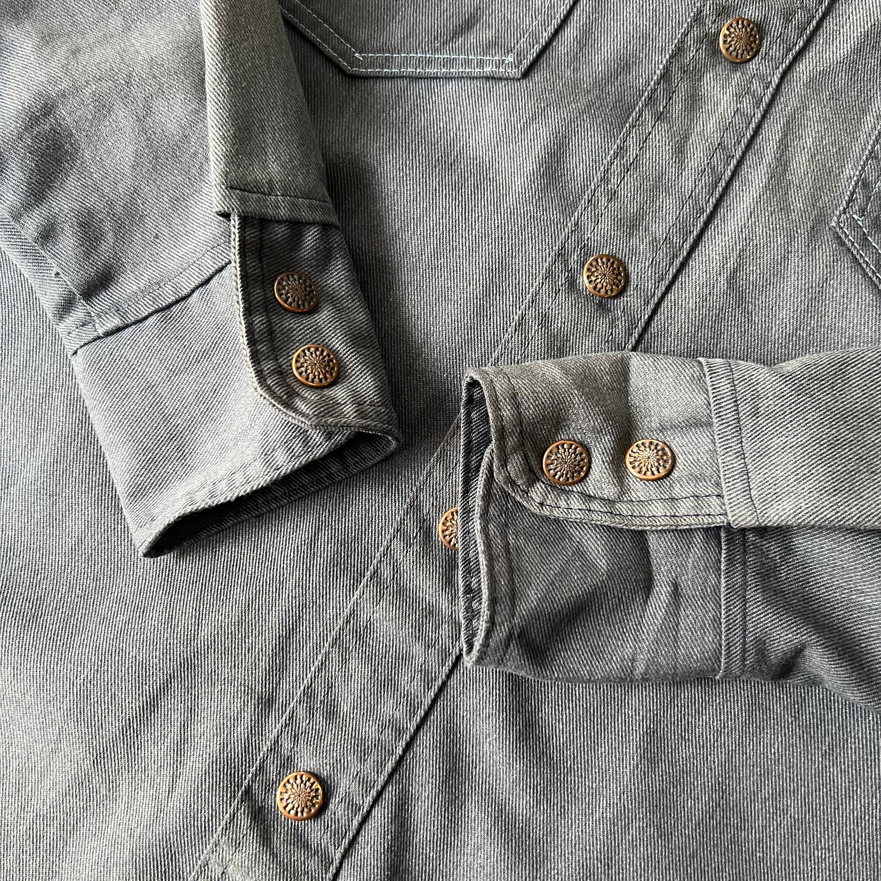 2個付いたカフススナップボタン仕様とドレスシャツよりなワークシャツ。