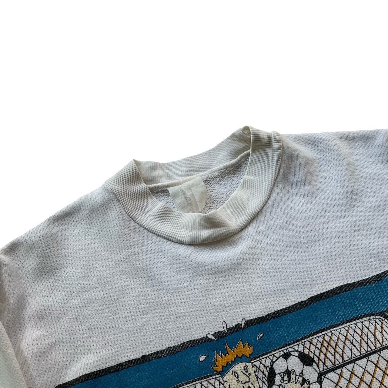 なぜか異様に体毛が濃く、ユニフォームがボロボロなサッカー選手2名が描かれている白ボディのスウェット。