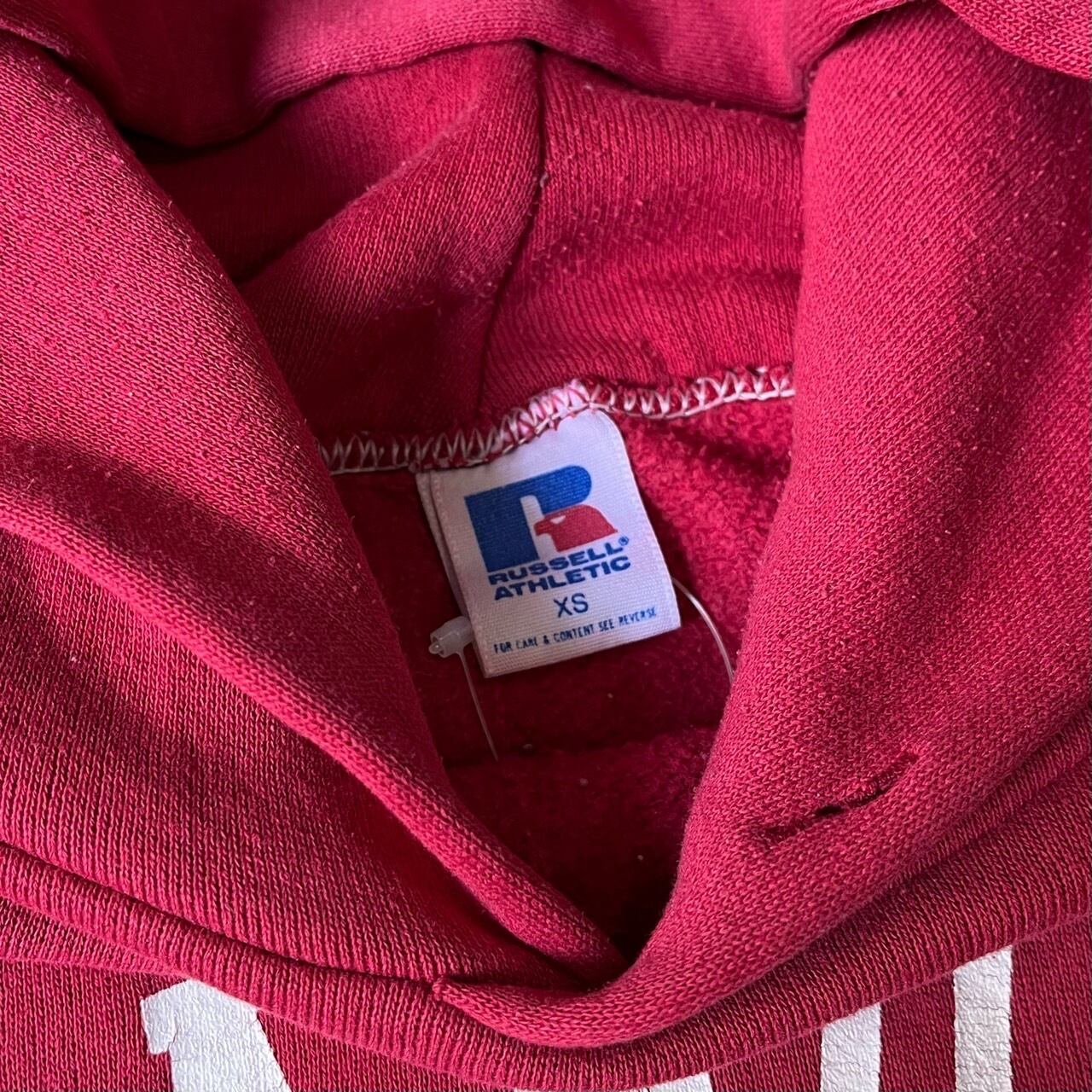 ワインレッドの色味にオンスの薄いフーディー。