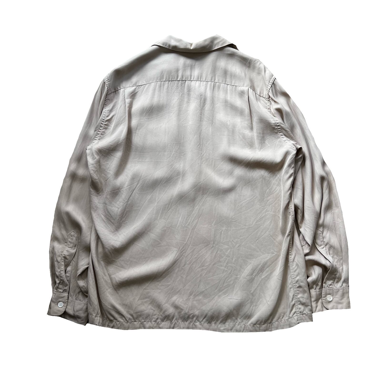 ヴィンテージの風合いを感じさせる50s レーヨンギャバジンボックスシャツ。滑らかな肌触りと光沢感が特徴で、上品な印象を与えます。