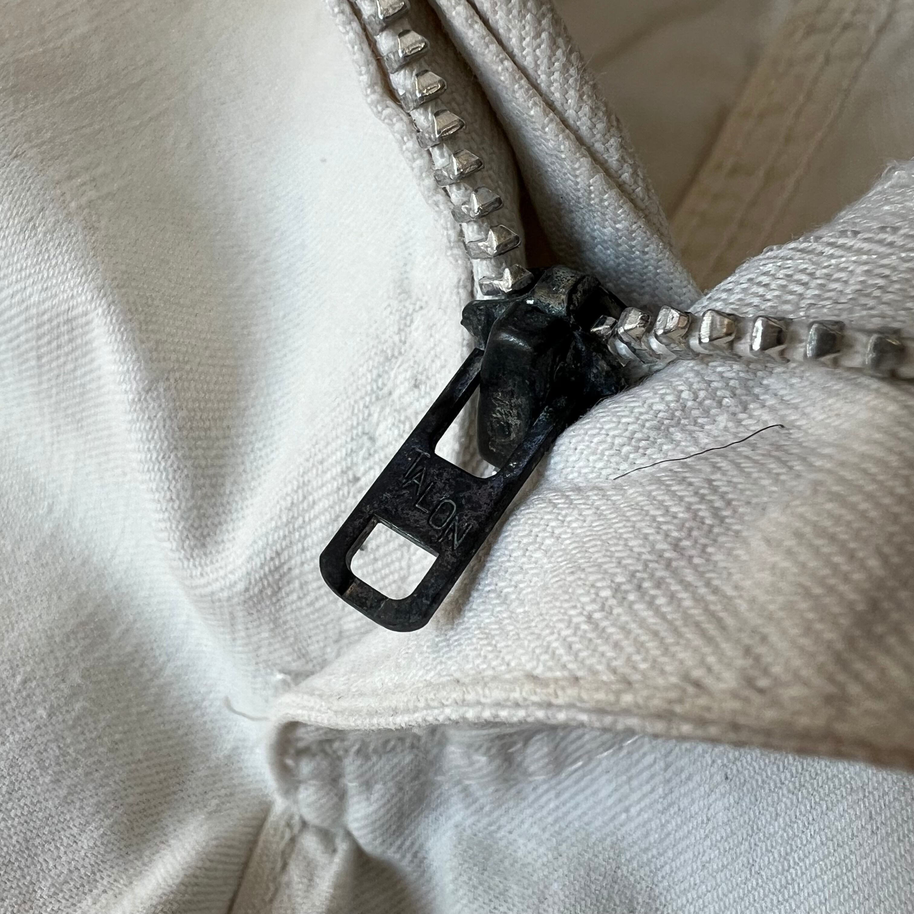 男らしいストレートに落ちるシルエットのアルミの42TALONジッパー。